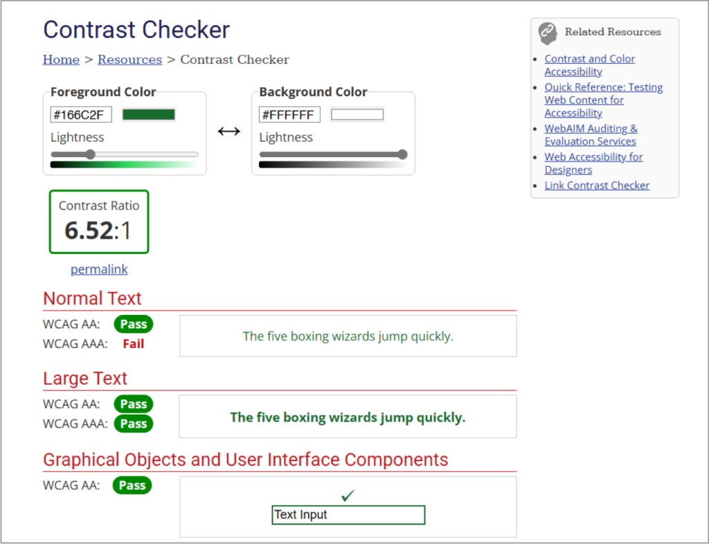 I checked my color palette with WebAIM’s contrast checker to ensure WCAG compliance. The white background, black text, and green buttons, links, and highlights I used met the minimum contrast requirement with an AA ratio of 6.52:1.