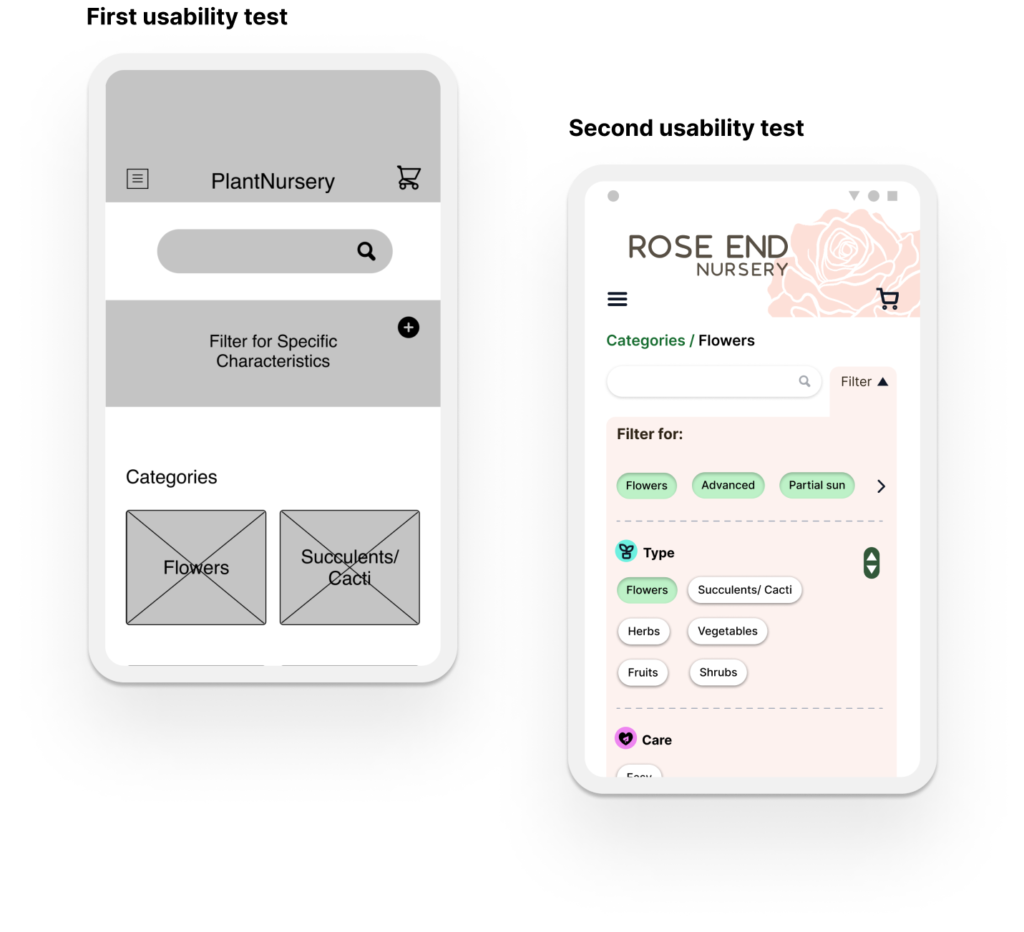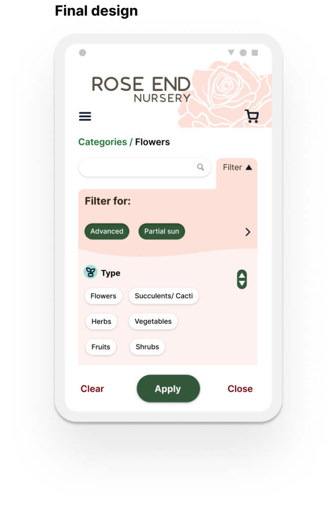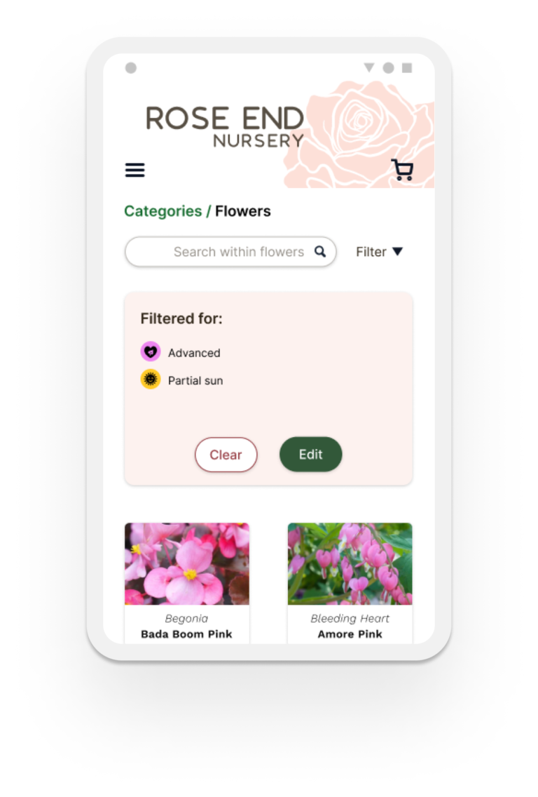 Rose End Nursery App provides a clean and minimalized user experience that prioritizes the information that gardeners are looking for. The search, filter, and categories work together seamlessly, allowing the user to easily find plants that meet their criteria. The design of these three functions focuses on transparency, ensuring that users always know if they are searching or filtering the entire site, or within a category.