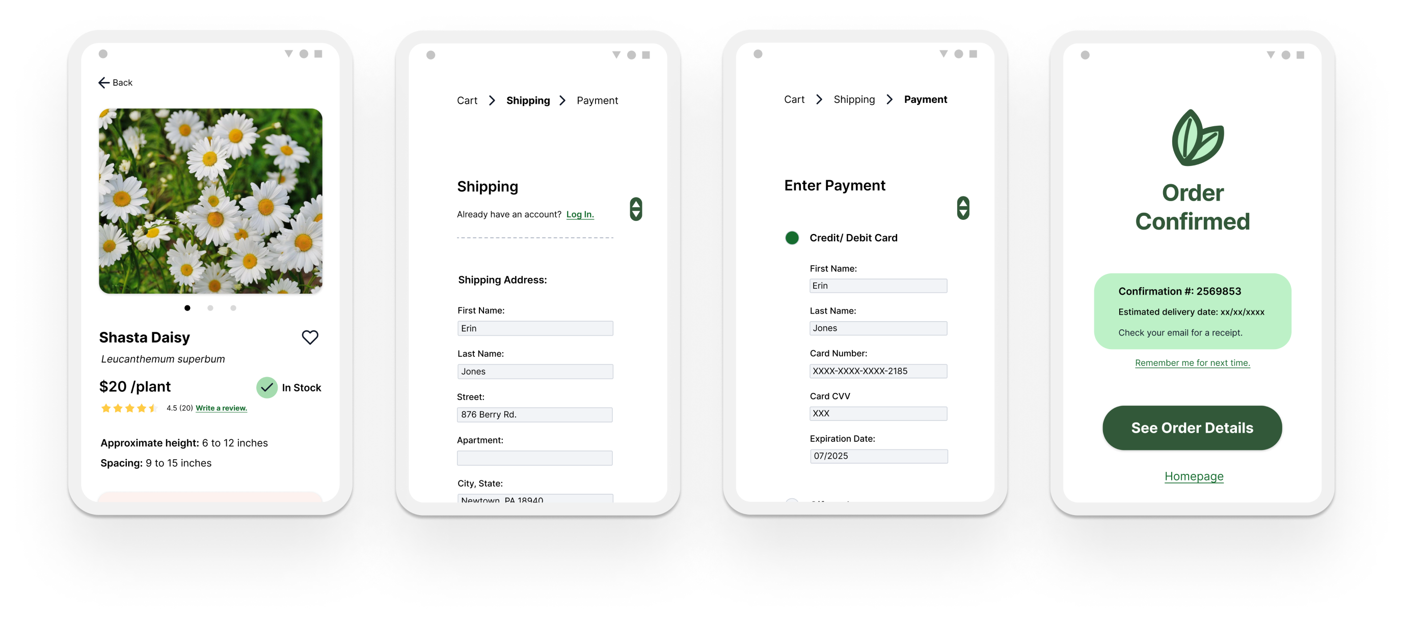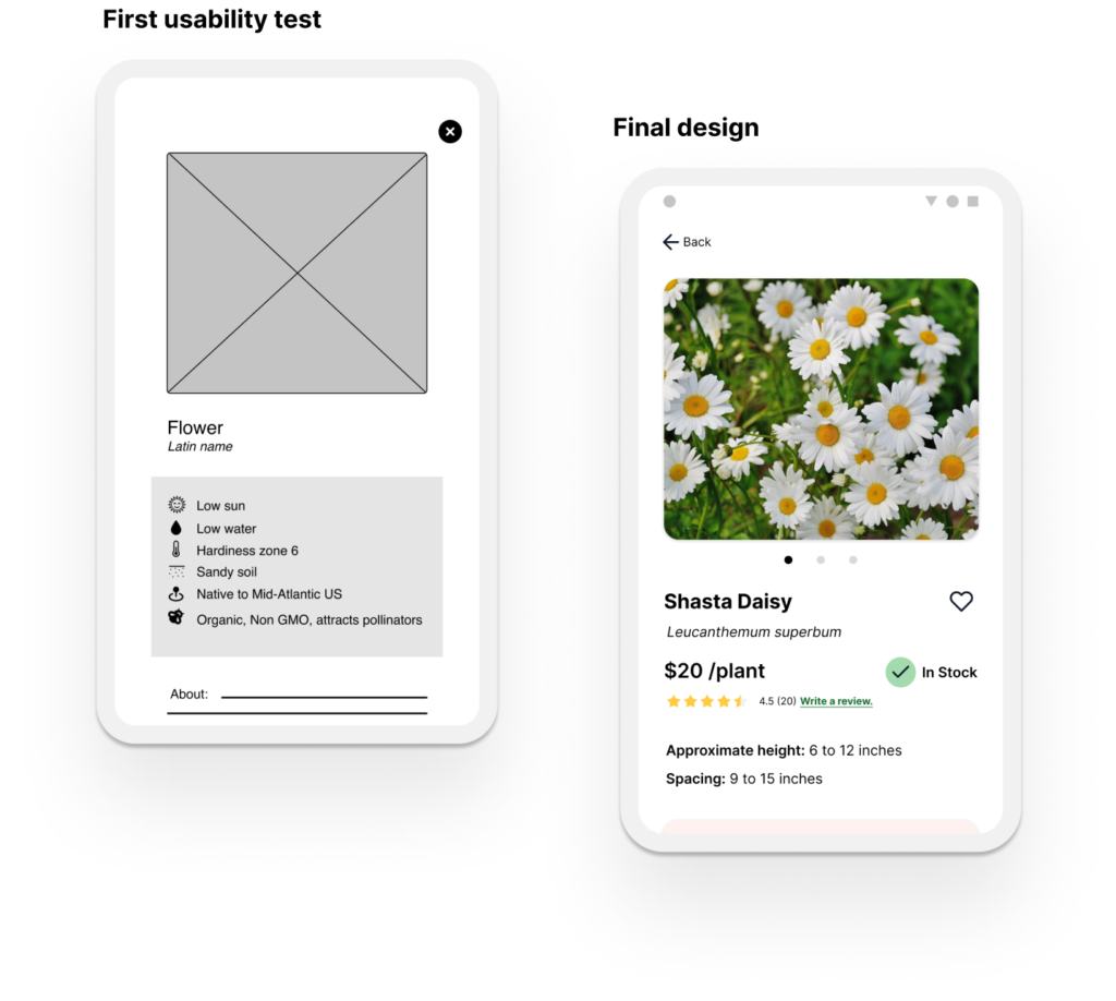 Users complained that inadequate information was a big frustration for them when shopping for plants. I designed a product description that is easily scannable and uses tags from the filter which helps maintain consistency and searchability across the application.