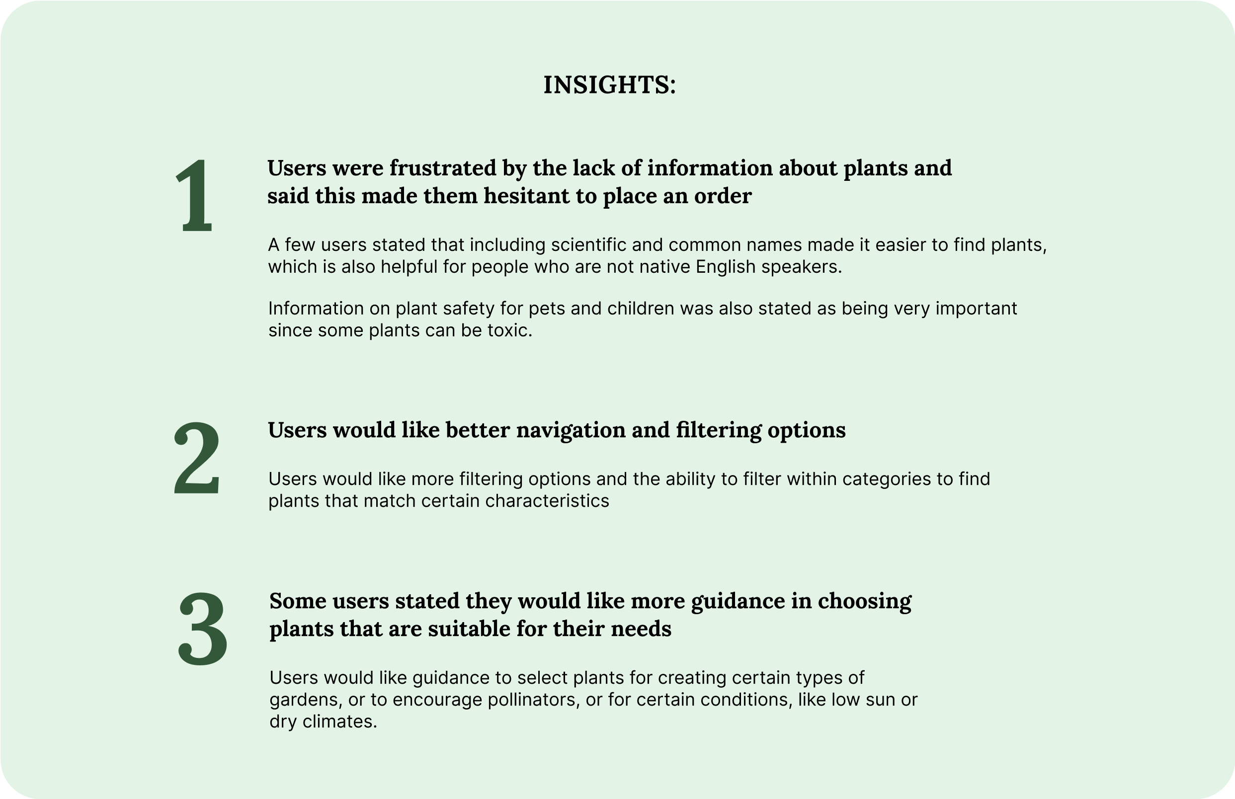 Users complained about difficulty finding what they wanted on plant nursery sites, either from lack of information, poor filtering options, or limited categories.